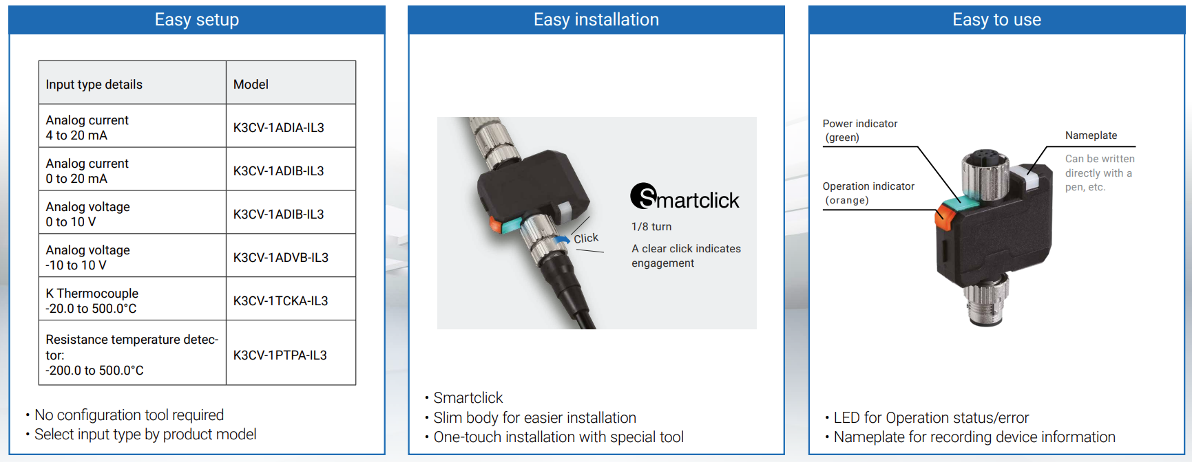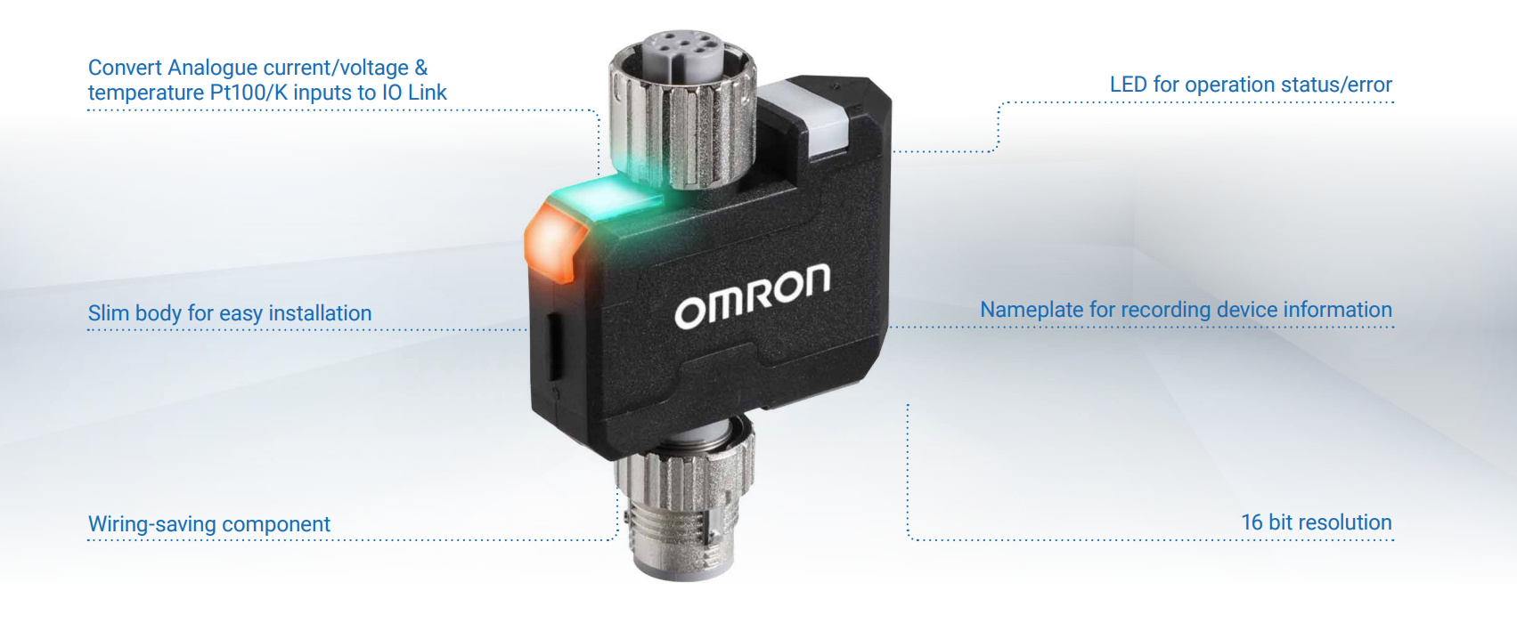 Širok nabor IoT izdelkov podjetja OMRON, od senzorjev do krmilnikov, omogoča fleksibilno konfiguracijo sistema ter enostavno načrtovanje, zagon in vzdrževanje IoT sistema. Kot proizvajalec krmilnikov PLC, OMRON ponuja tudi različne IO-Link masterje in komponente z uporabnimi funkcijami, kar olajša uvedbo sistema IO-Link.