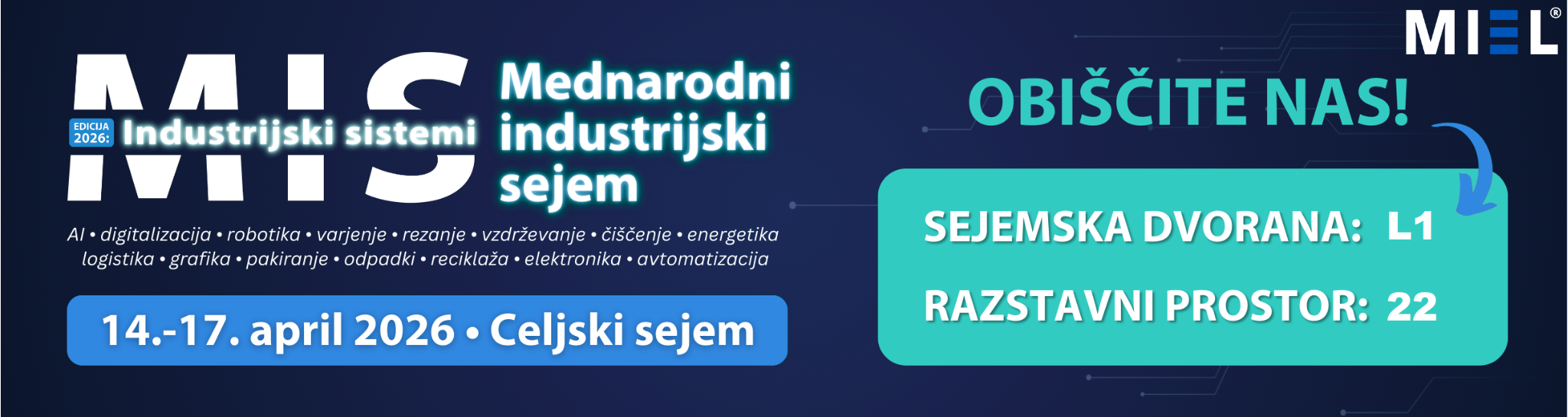 Vabimo vas na Mednarodni industrijski sejem MIS celje, ki bo potekal od torka 14.4.2026 do petka 17.4.2026 med 9:00 in 17:30 uro